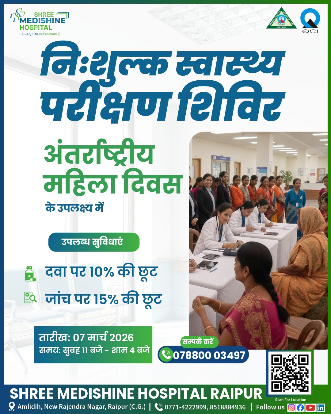 अंतरराष्ट्रीय महिला दिवस के अवसर पर श्री मेडिशाइन हॉस्पिटल, रायपुर द्वारा 07 मार्च 2026 को निःशुल्क स्वास्थ्य परीक्षण शिविर का आयोजन किया जाएगा। शिविर का समय सुबह 11 बजे से शाम 4 बजे तक निर्धारित किया गया है।