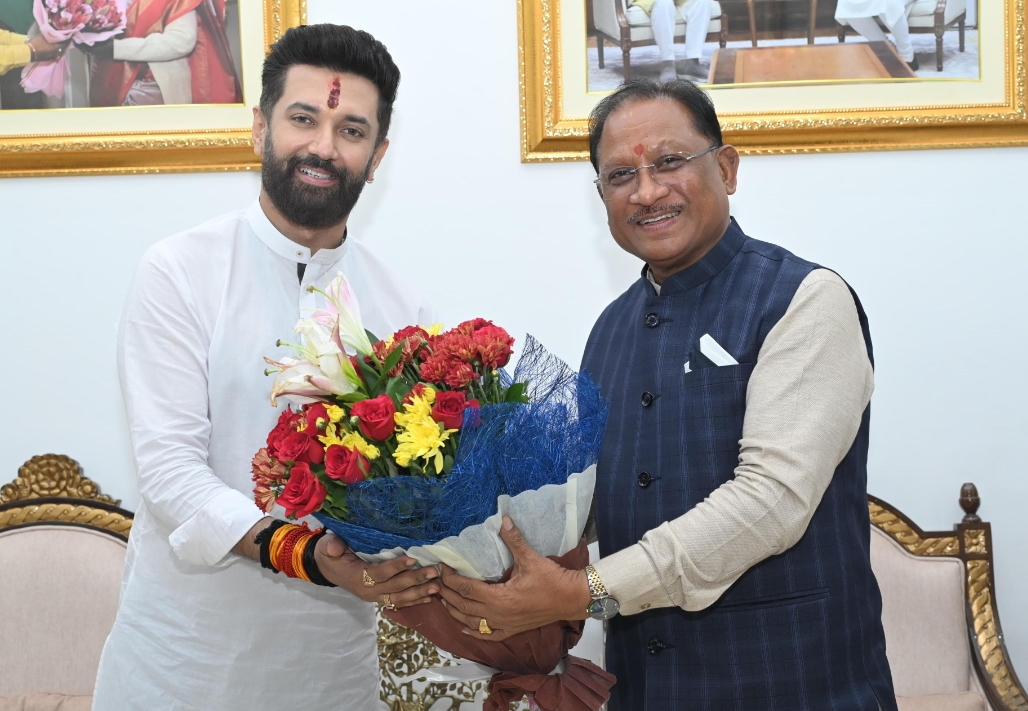 मुख्यमंत्री विष्णु देव साय से आज मुख्यमंत्री निवास कार्यालय में केन्द्रीय खाद्य प्रसंस्करण उद्योग मंत्री चिराग पासवान ने सौजन्य मुलाकात की। इस दौरान साय ने पासवान को कोसा वस्त्र एवं बेल मेटल से बने स्मृति चिन्ह भेंटकर आत्मीय स्वागत किया। गौरतलब है कि केन्द्रीय खाद्य प्रसंस्करण उद्योग मंत्री चिराग पासवान आज एक दिवसीय प्रवास पर छत्तीसगढ़ पहुंचे थे।