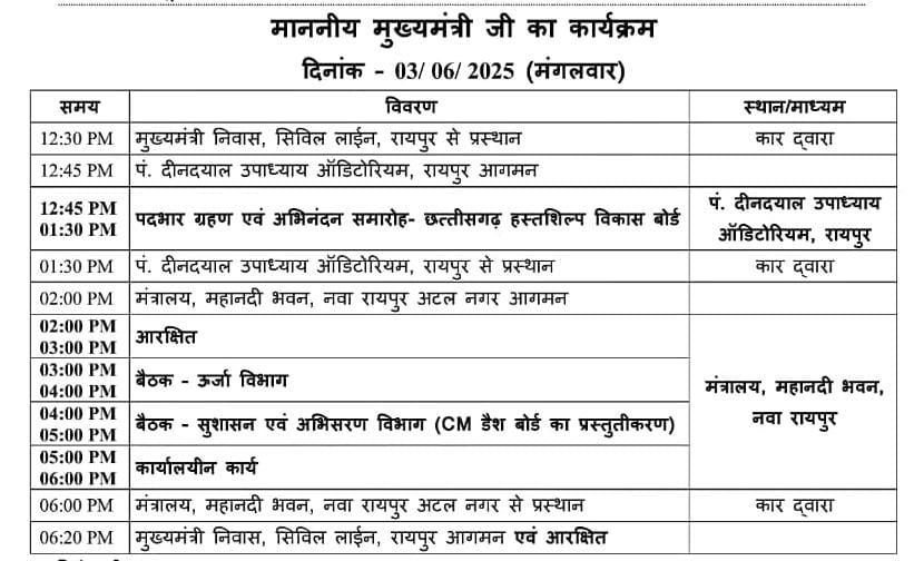 कार्यक्रम के अनुसार मुख्यमंत्री 06:00 बजे मंत्रालय से प्रस्थान कर 06:20 बजे मुख्यमंत्री निवास, सिविल लाइंस रायपुर पहुंचेंगे, जहाँ समय आरक्षित रहेगा।