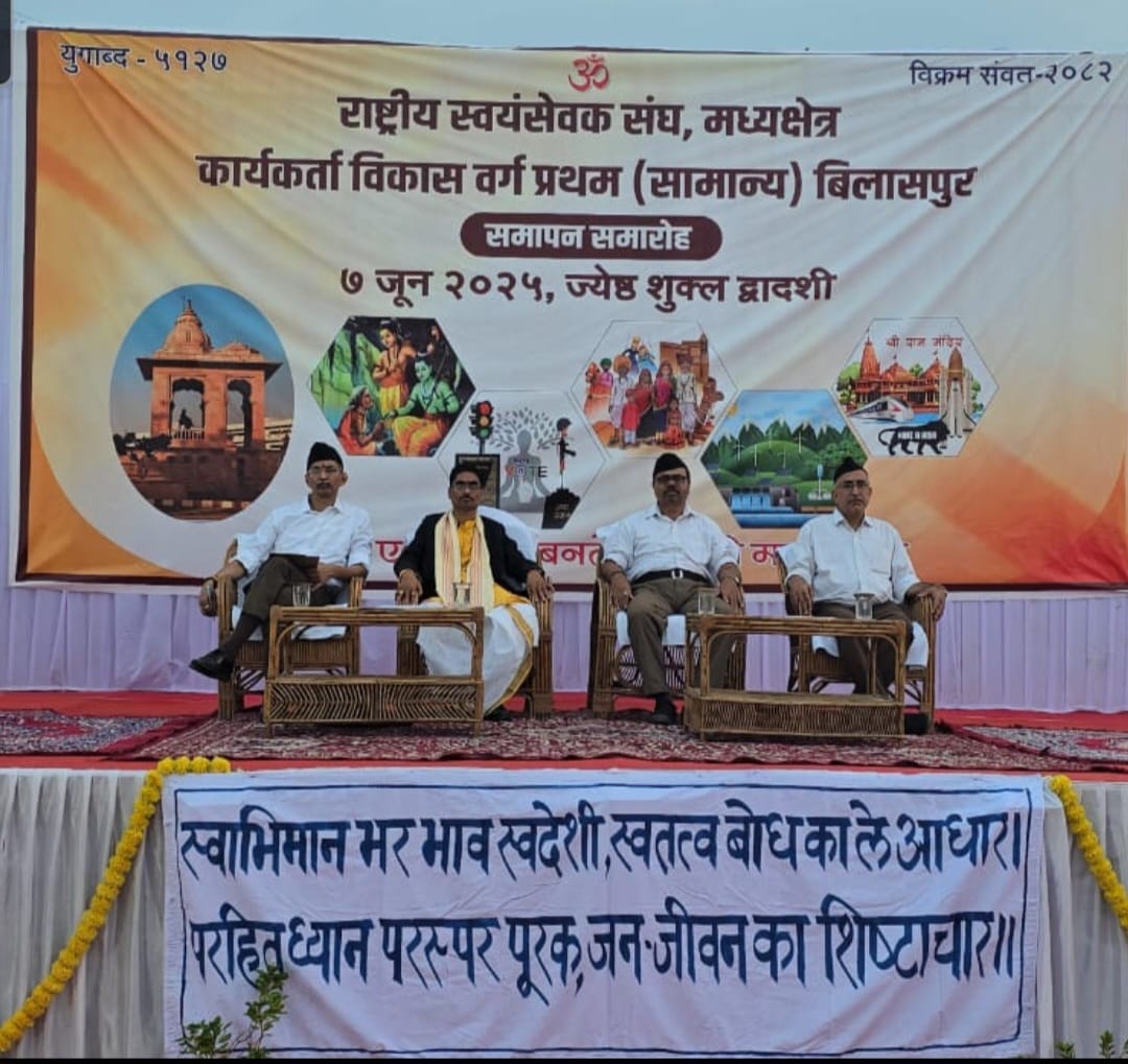 कोनी स्थित सरस्वती शिशु मंदिर परिसर में राष्ट्रीय स्वयंसेवक संघ (RSS) के मध्य क्षेत्र का कार्यकर्ता विकास वर्ग-प्रथम (सामान्य) का समापन समारोह उत्साहपूर्वक सम्पन्न हुआ। यह प्रशिक्षण वर्ग 18 मई से 7 जून तक आयोजित किया गया था, जिसमें 382 स्वयंसेवकों ने भाग लिया।