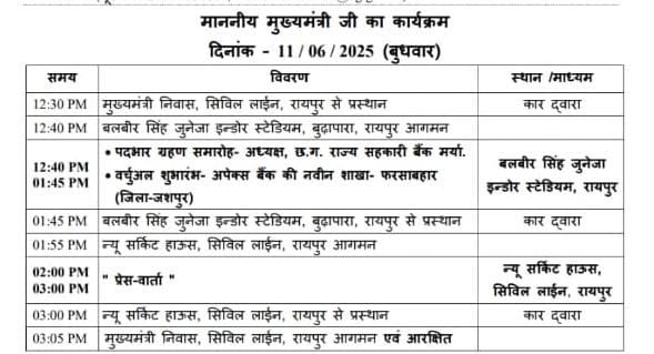 राज्य के मुख्यमंत्री साय 11 जून 2025 (बुधवार) को राजधानी रायपुर में विभिन्न महत्वपूर्ण कार्यक्रमों में शिरकत करेंगे। निर्धारित कार्यक्रम के अनुसार, वे दोपहर 12:30 बजे मुख्यमंत्री निवास, सिविल लाइंस से कार द्वारा बलबीर सिंह जुनेजा इंडोर स्टेडियम, बुढ़ापारा के लिए प्रस्थान करेंगे।