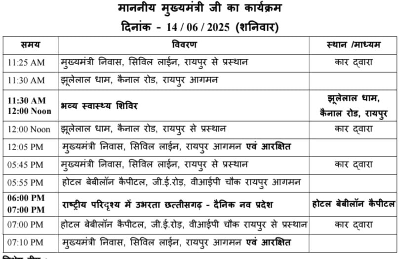 मुख्यमंत्री सुबह 11:25 बजे मुख्यमंत्री निवास सिविल लाइंस से प्रस्थान करेंगे और 11:30 बजे झूलेलाल धाम, कैनाल रोड पहुंचेंगे। यहां वे 11:30 बजे से दोपहर 12:00 बजे तक आयोजित भव्य स्वास्थ्य शिविर में शामिल होंगे, जो जनकल्याण और स्वास्थ्य जागरूकता की दिशा में सरकार की प्रतिबद्धता को दर्शाता है।