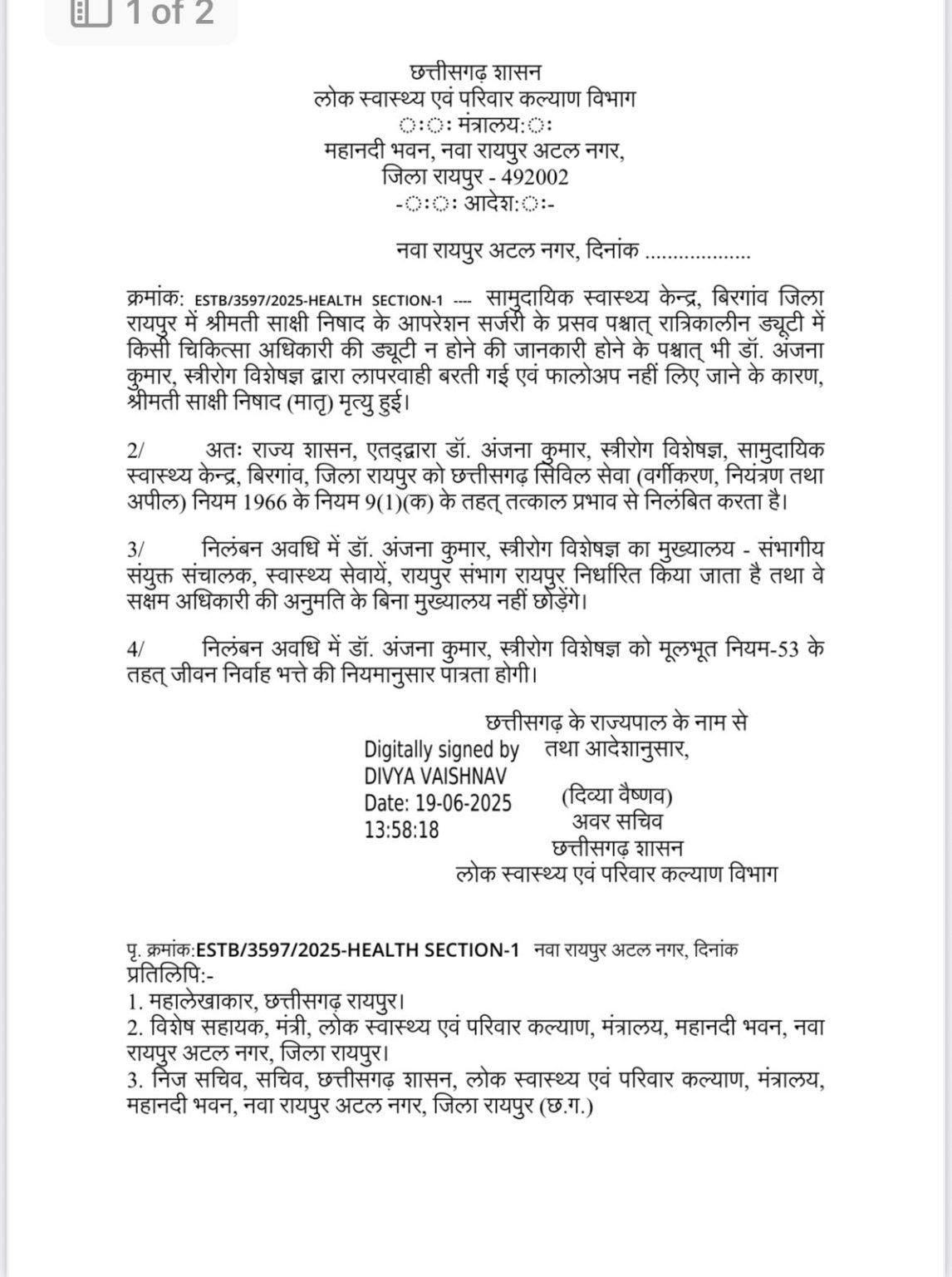 मंत्रालय से जारी आदेश में कहा गया है कि जांच में यह स्पष्ट हुआ कि डिलीवरी के बाद रात में किसी भी चिकित्सा अधिकारी की ड्यूटी नहीं थी। साथ ही डॉक्टर अंजना कुमार ने प्रसूता की स्थिति का उचित फॉलोअप नहीं लिया, जिससे लापरवाही के चलते उसकी मौत हुई।