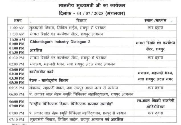 मुख्यमंत्री का 11:30 बजे मायरा रिसॉर्ट एंड कन्वेंशन सेंटर में आगमन निर्धारित है, जहां वे “Chhattisgarh Industry Dialogue 2” में शामिल होंगे। यह संवाद सत्र दोपहर 1:00 बजे तक चलेगा। इसके पश्चात 1:00 से 1:30 बजे तक का समय आरक्षित रहेगा।