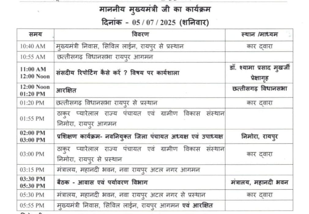 मुख्यमंत्री 3:30 बजे आवास एवं पर्यावरण विभाग की बैठक की अध्यक्षता करेंगे, जो शाम 5:30 बजे तक चलेगी। इसके बाद वे मंत्रालय से रवाना होकर 5:55 बजे मुख्यमंत्री निवास, सिविल लाइंस लौटेंगे, जहां उनका शेष समय आरक्षित रहेगा।