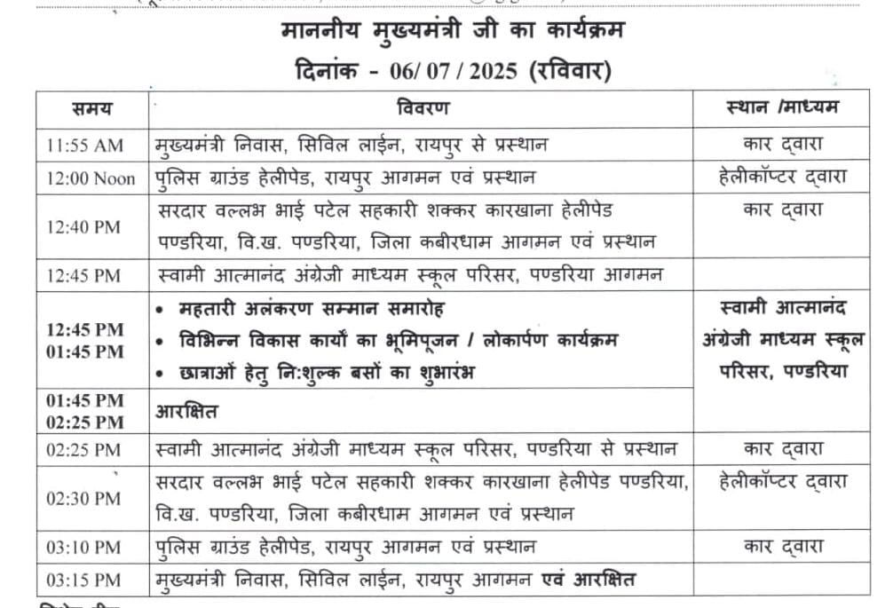 - 11:55 AM: मुख्यमंत्री निवास, रायपुर से कार द्वारा प्रस्थान