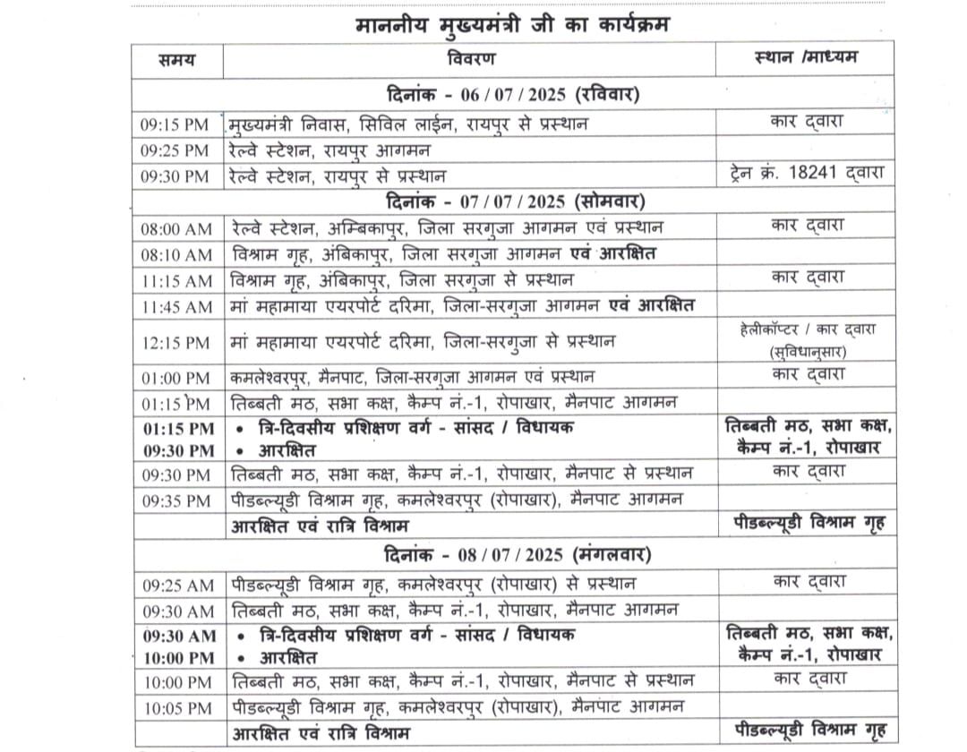 मुख्यमंत्री विष्णु देव साय 7 जुलाई को सरगुजा जिले के अंबिकापुर और मैनपाट क्षेत्र के दौरे पर रहेंगे। वे सुबह 8:00 बजे ट्रेन के माध्यम से अंबिकापुर रेलवे स्टेशन पहुंचेंगे, जहाँ से 8:10 बजे विश्राम गृह अंबिकापुर पहुँचेंगे और कुछ समय आरक्षित रहेंगे।