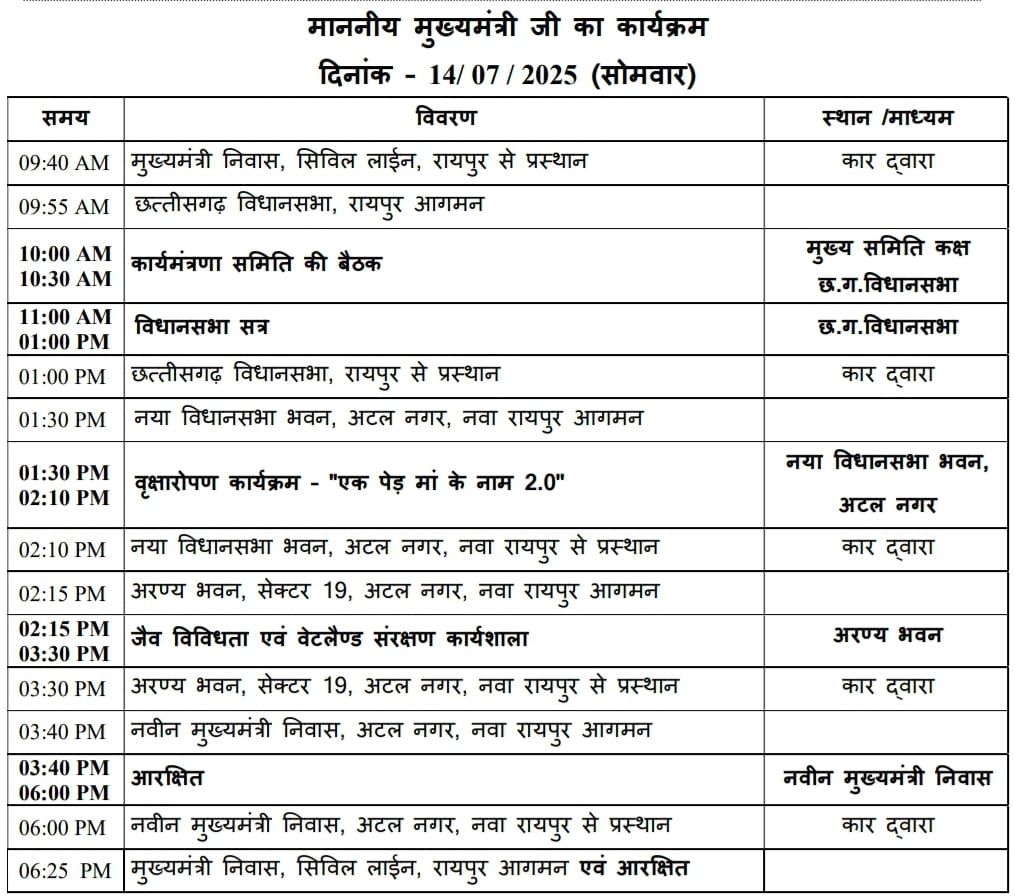 दोपहर 1:00 बजे विधानसभा परिसर से प्रस्थान करने के बाद मुख्यमंत्री 1:30 बजे अटल नगर स्थित नए विधानसभा भवन पहुंचेंगे, जहां वे “एक पेड़ मां के नाम 2.0” अभियान के अंतर्गत वृक्षारोपण कार्यक्रम में शामिल होंगे। इसके बाद 2:10 बजे वे अरण्य भवन के लिए रवाना होंगे और 2:15 बजे से 3:30 बजे तक आयोजित जैव विविधता एवं वेटलैंड संरक्षण कार्यशाला में हिस्सा लेंगे।