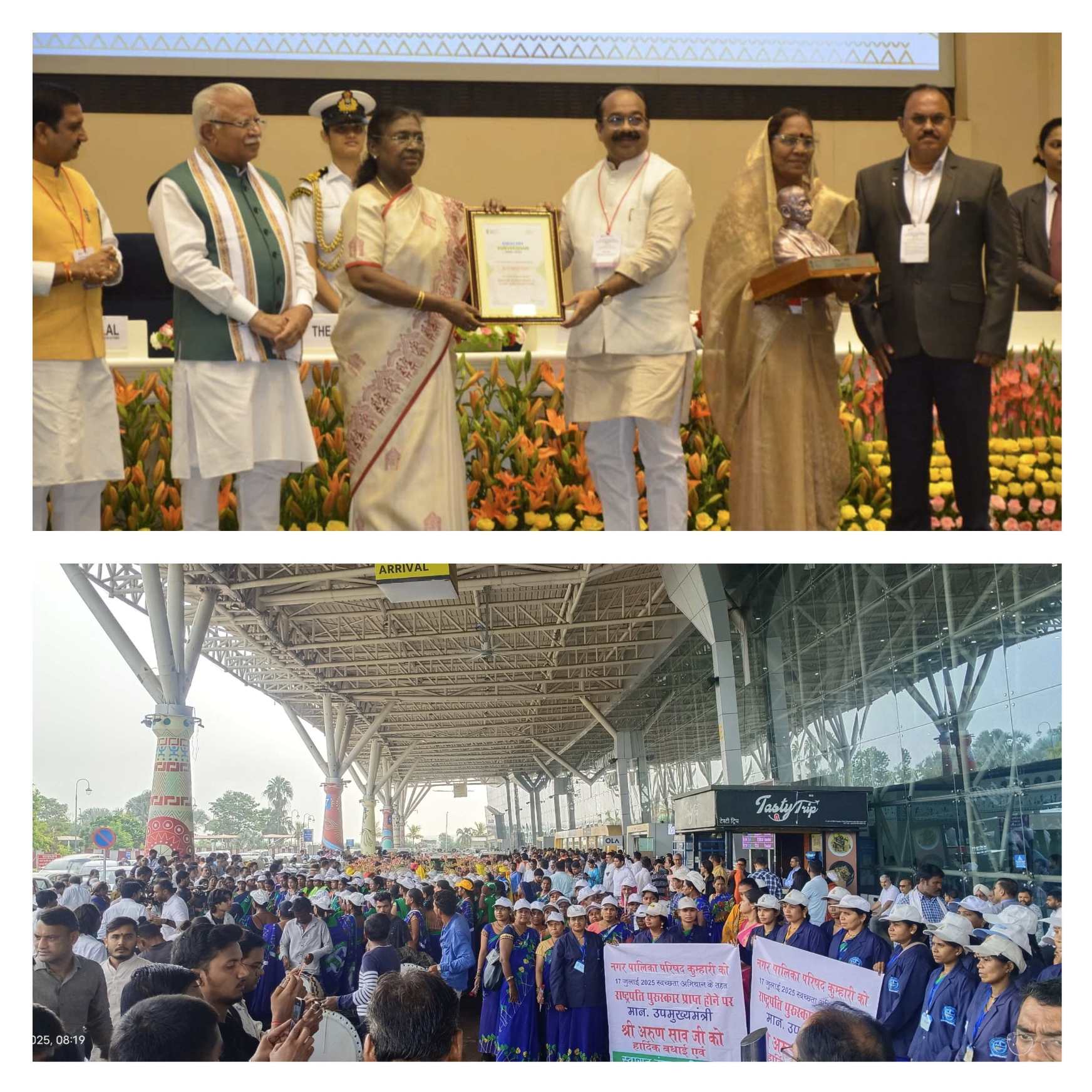 छत्तीसगढ़ के नगरीय प्रशासन विभाग की जिम्मेदारी संभाल रहे उपमुख्यमंत्री अरुण साव थोड़ी देर में रायपुर एयरपोर्ट पहुंचने वाले हैं । राष्ट्रीय स्तर पर स्वच्छता के क्षेत्र में सात राष्ट्रीय पुरस्कार प्राप्त कर लौट रहे अरुण साव के स्वागत के लिए रायपुर एयरपोर्ट में प्रशंसकों के साथ नगरीय निकाय क्षेत्रों से आए स्वच्छता दीदी और कार्यकर्ताओं की भारी भीड़ पहुंची है । आपको बताते चलें कि कल देश की राजधानी नई दिल्ली में राष्ट्रपति द्रौपदी मुर्मू के हाथों साथ राष्ट्रीय पुरस्कार छत्तीसगढ़ को मिले हैं । इस खास मौके पर प्रदेश के उपमुख्यमंत्री अरुण साव भी मौजूद रहे और उन्होंने राष्ट्रपति के हाथों पुरस्कार ग्रहण किया है ।