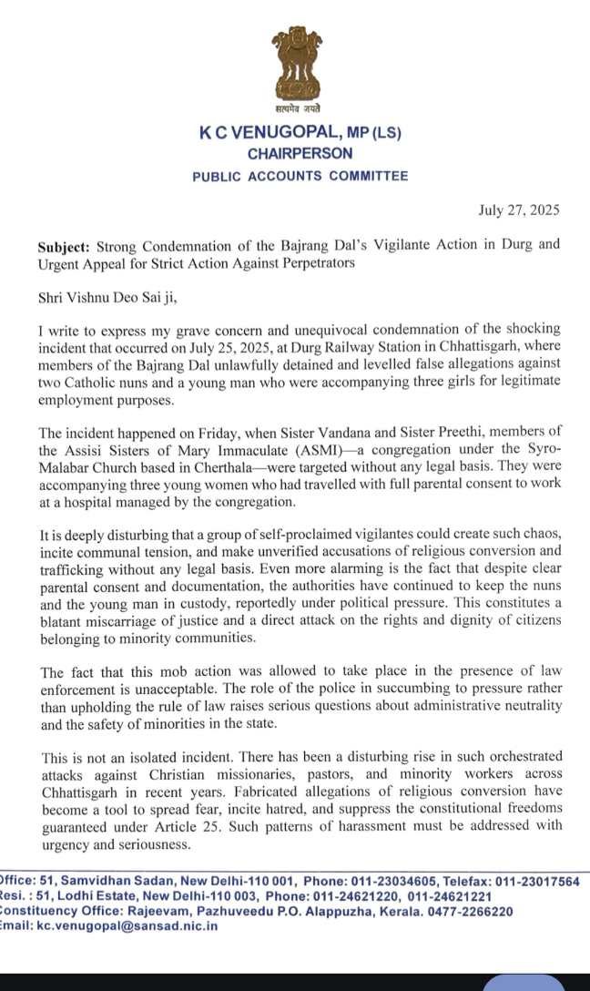 मैं 25 जुलाई, 2025 को छत्तीसगढ़ के दुर्ग रेलवे स्टेशन पर हुई उस चौंकाने वाली घटना पर अपनी गहरी चिंता और स्पष्ट निंदा व्यक्त करता हूँ, जहाँ बजरंग दल के सदस्यों ने दो कैथोलिक ननों और एक युवक को गैरकानूनी रूप से हिरासत में लिया और उन पर झूठे आरोप लगाए, जो वैध रोजगार के उद्देश्य से तीन लड़कियों के साथ जा रहे थे।