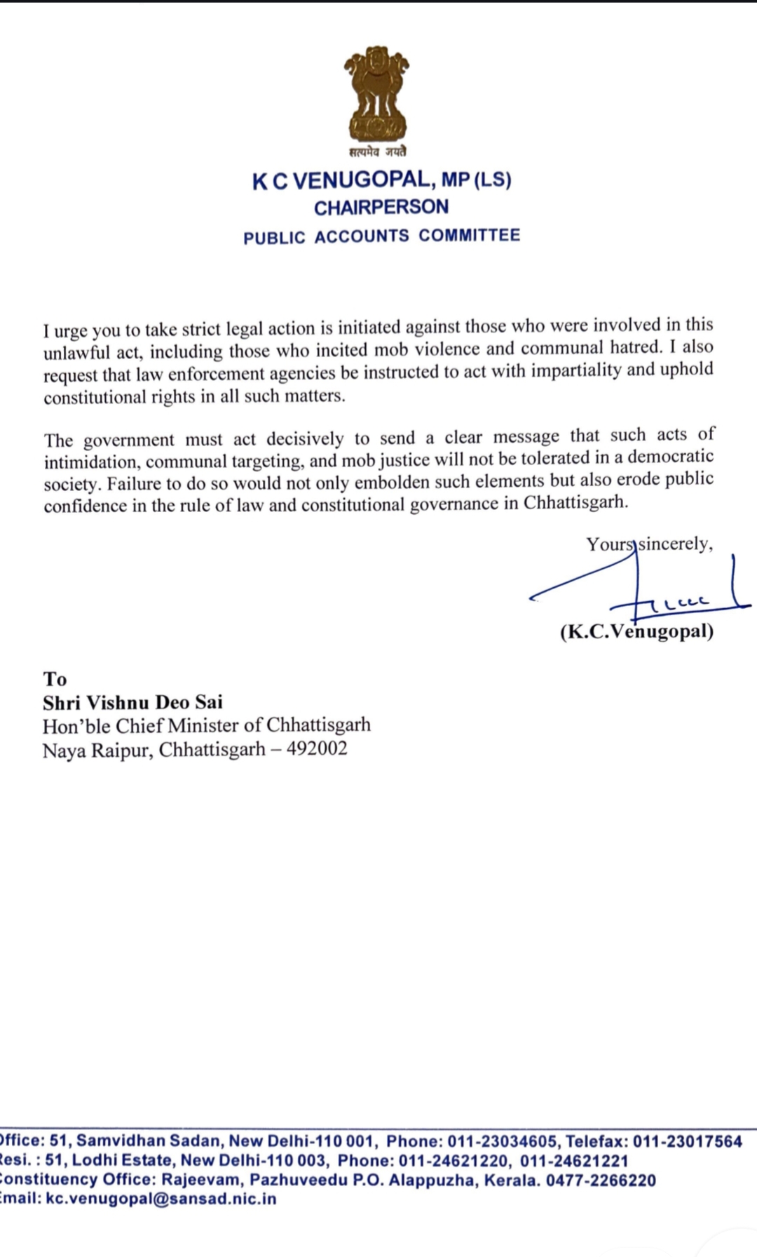 मैं आपसे आग्रह करता हूँ कि इस गैरकानूनी कृत्य में शामिल लोगों, जिनमें भीड़ हिंसा और सांप्रदायिक द्वेष भड़काने वाले लोग भी शामिल हैं, के विरुद्ध कड़ी कानूनी कार्रवाई की जाए। मैं यह भी अनुरोध करता हूँ कि कानून प्रवर्तन एजेंसियों को निष्पक्षता से कार्य करने और ऐसे सभी मामलों में संवैधानिक अधिकारों की रक्षा करने का निर्देश दिया जाए।