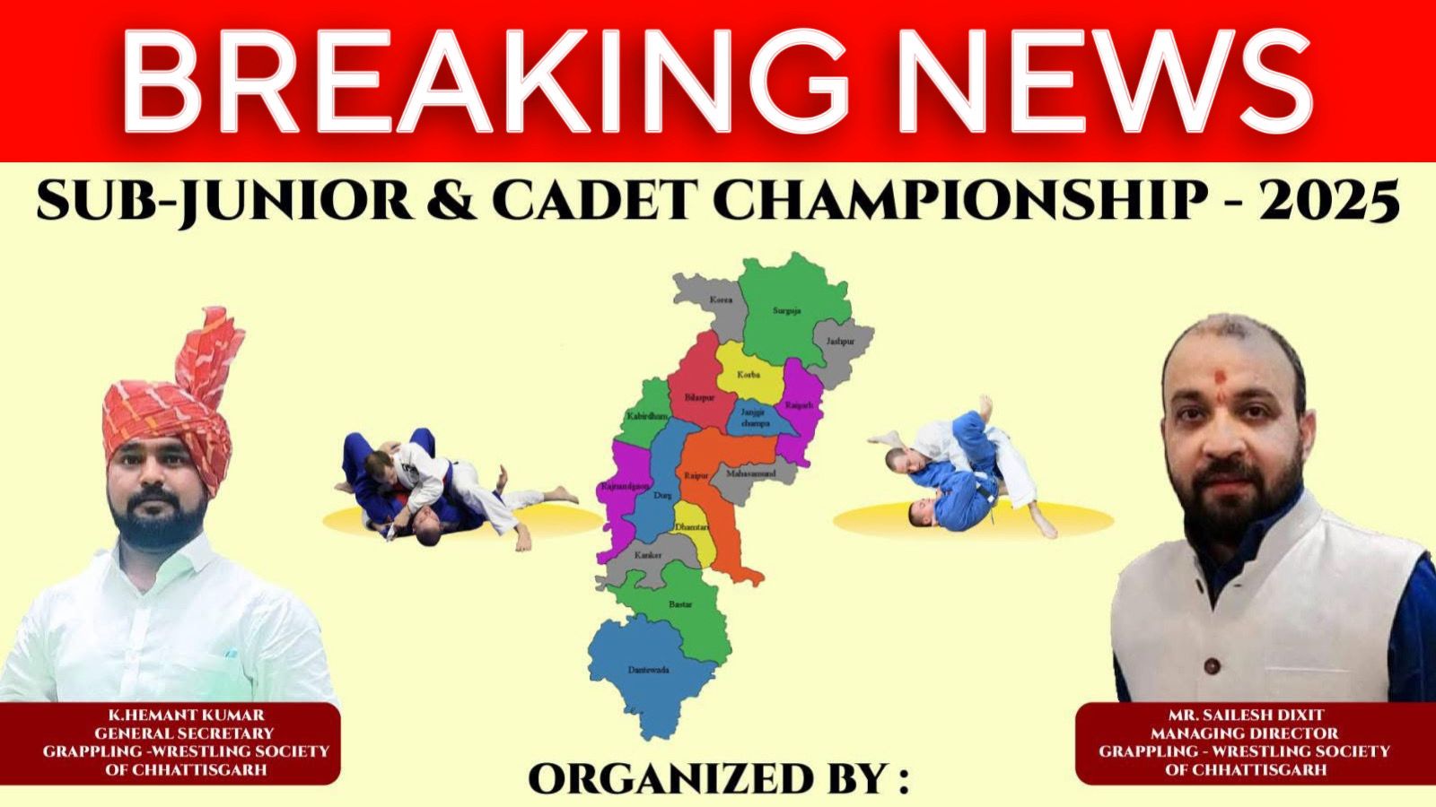इस प्रतिष्ठित आयोजन की मेज़बानी ग्रैपलिंग रेसलिंग सोसाइटी ऑफ छत्तीसगढ़ कर रही है। आयोजन समिति के जनरल सेक्रेटरी के हेमंत कुमार और मैनेजिंग डायरेक्टर शैलेश दीक्षित के नेतृत्व में चैंपियनशिप की सभी तैयारियाँ जोरों पर हैं।