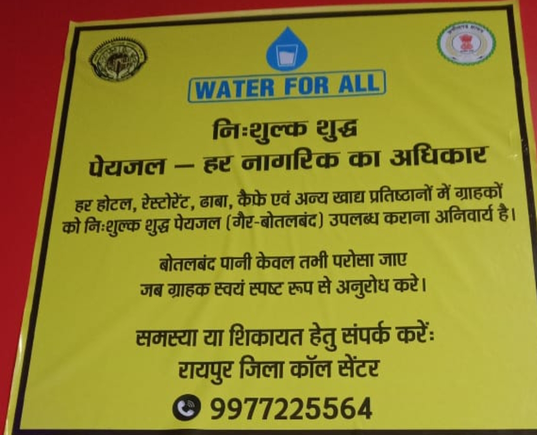 छत्तीसगढ़ की राजधानी रायपुर में ग्राहकों से जबरन बोतलबंद पानी की बिक्री पर अब रोक लगाई जा रही है। रायपुर नगर निगम ने नगरीय प्रशासन एवं विकास विभाग के निर्देश पर “वॉटर फॉर ऑल” अभियान की शुरुआत की है। इसका मकसद यह सुनिश्चित करना है कि शहर के हर होटल, रेस्टोरेंट, ढाबा, कैफे व अन्य खाद्य प्रतिष्ठान ग्राहकों को निःशुल्क शुद्ध पेयजल उपलब्ध कराएं।