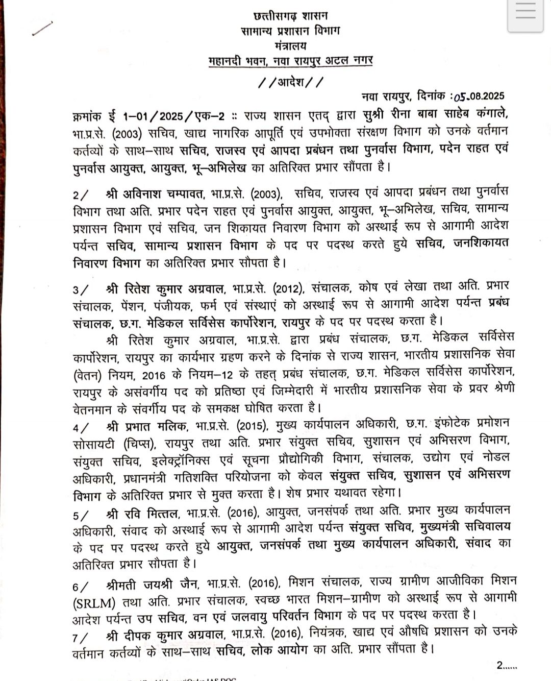चिप्स (CHiPS) के सीईओ प्रभात मलिक को संयुक्त सचिव, सुशासन एवं अभिसरण विभाग के अतिरिक्त प्रभार से मुक्त किया गया है। वहीं, जनसंपर्क आयुक्त रवि मित्तल को संयुक्त सचिव, मुख्यमंत्री सचिवालय पदस्थ किया गया है। जयश्री जैन को उप सचिव, वन एवं जलवायु परिवर्तन विभाग पदस्थ किया गया है।