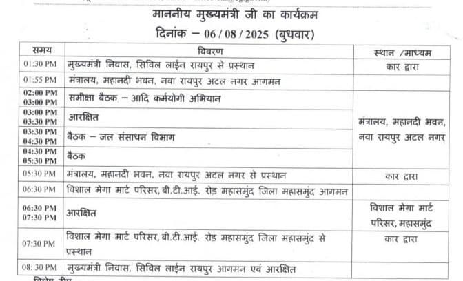 मुख्यमंत्री 05:30 बजे मंत्रालय से प्रस्थान कर महासमुंद के लिए रवाना होंगे। शाम 06:30 बजे वे महासमुंद के बी.टी.आई. रोड स्थित विशाल मेगा मार्ट परिसर में पहुंचेंगे। वहाँ 06:30 से 07:30 बजे तक आरक्षित कार्यक्रम रहेगा। 07:30 बजे मुख्यमंत्री महासमुंद से प्रस्थान कर 08:30 बजे पुनः मुख्यमंत्री निवास, रायपुर लौट आएंगे।