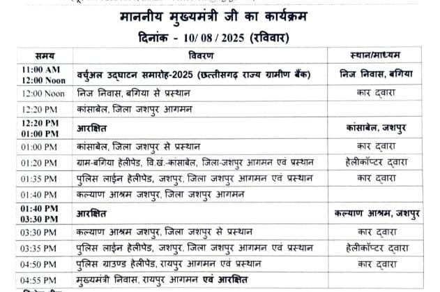 1:40 बजे मुख्यमंत्री कल्याण आश्रम, जशपुर में पहुंचेंगे, जहां दोपहर और शाम तक कार्यक्रम आयोजित होंगे। 3:30 बजे जशपुर से हेलीकॉप्टर द्वारा रवाना होकर 4:50 बजे रायपुर पुलिस ग्राउंड हेलीपेड पहुंचेंगे और कार से मुख्यमंत्री निवास जाएंगे।