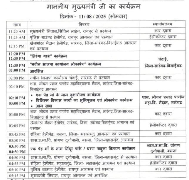 दौरे के अगले चरण में मुख्यमंत्री 3:45 बजे रोहिना हेलीपैड, बसना (महासमुंद) पहुंचेंगे और 3:50 से 4:50 बजे तक शासकीय उच्च माध्यमिक विद्यालय प्रांगण, दुर्गापाली में “एक पेड़ माँ के नाम” कार्यक्रम, सिंदूर पार्क और चरण पादुका वितरण कार्यक्रम में शामिल होंगे।