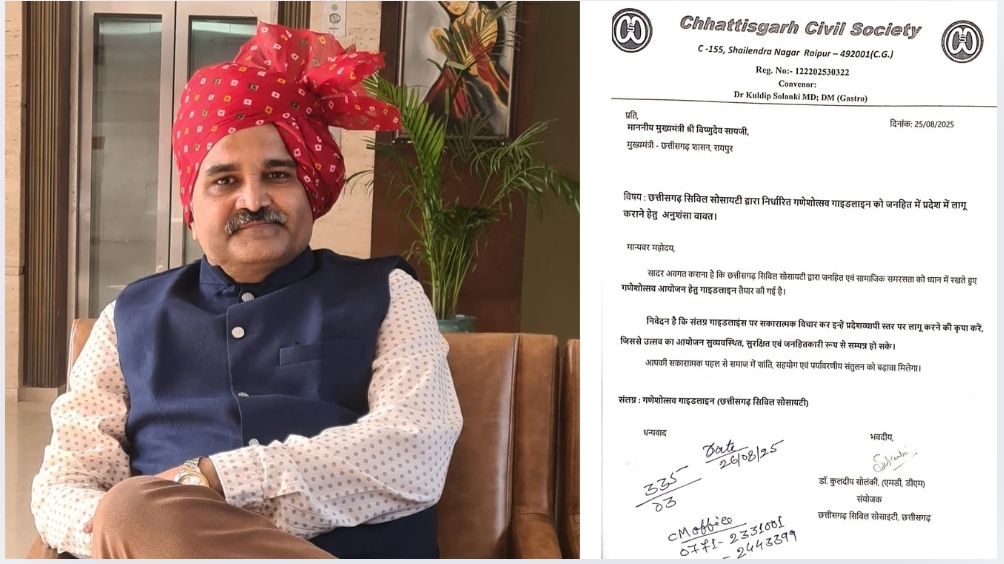 गणेशोत्सव को लेकर छत्तीसगढ़ सिविल सोसायटी ने विस्तृत गाइडलाइन तैयार कर राज्य सरकार को सौंपी है। संगठन का कहना है कि इन नियमों के पालन से उत्सव न केवल अधिक सुव्यवस्थित और सुरक्षित होगा, बल्कि सामाजिक समरसता और पर्यावरणीय संतुलन को भी बढ़ावा मिलेगा।