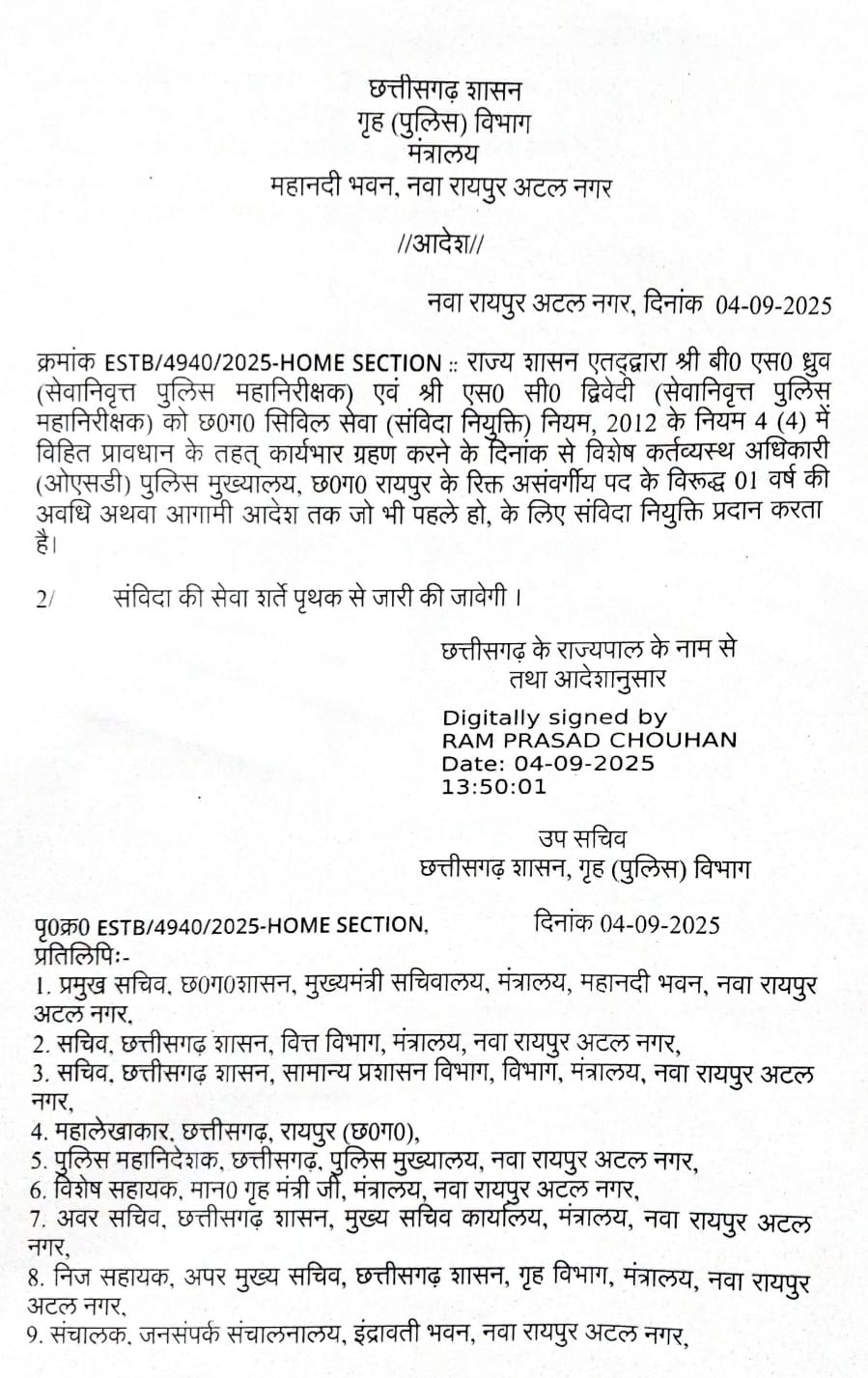 प्रदेश की साय सरकार पुलिसिंग को मजबूत करने और वरिष्ठ अफसरों के अनुभव का लाभ लेने के मकसद से राज्य के दो सेवानिवृत्त भारतीय पुलिस सेवा अधिकारियों को संविदा नियुक्ति प्रदान किया है।