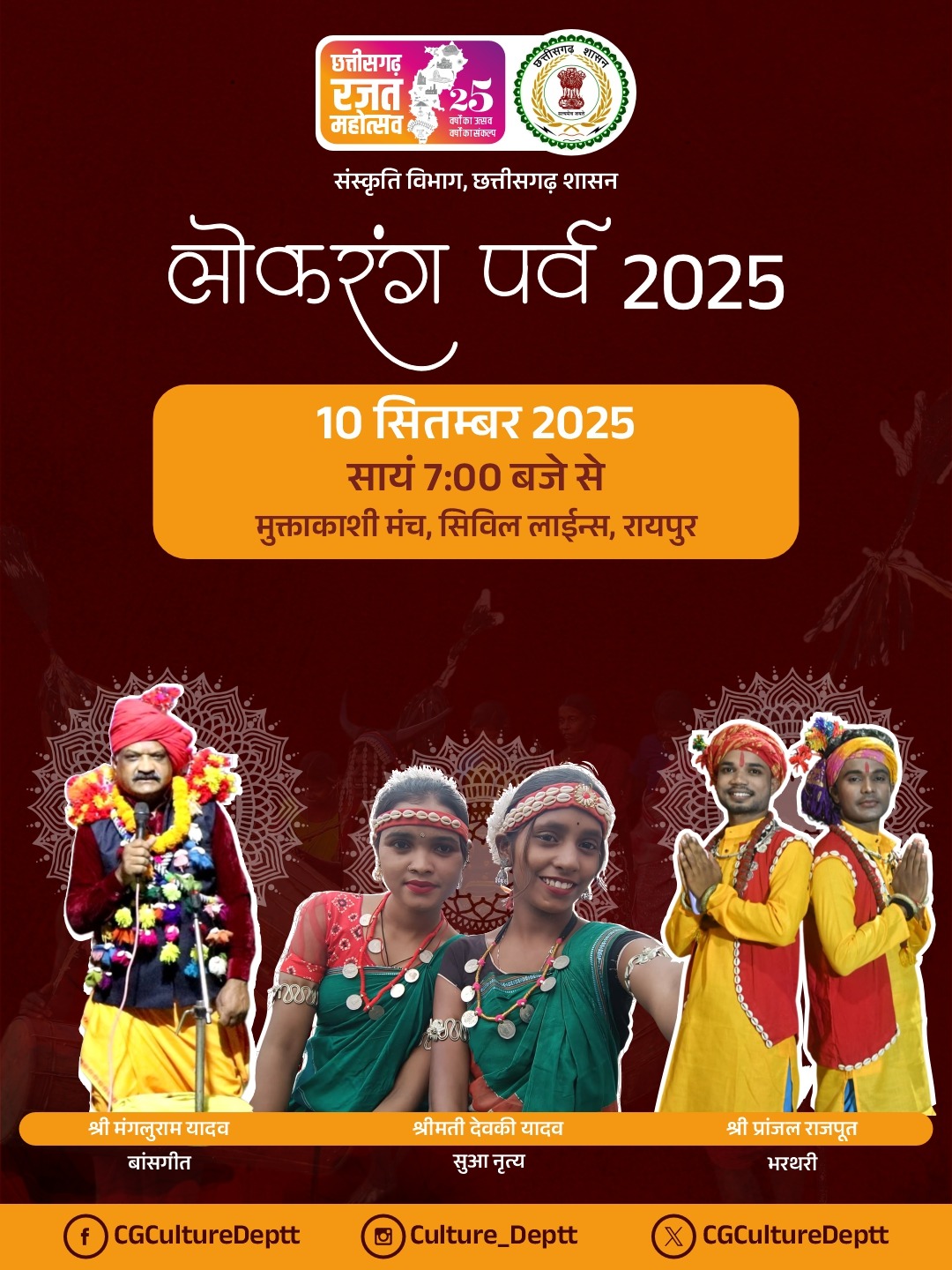 कार्यक्रम में पारंपरिक लोकगाथा प्रस्तुतियों में भरथरी, पंडवानी, ढोलामारू और लोरिक चंदा, लोकनृत्य में सुआ, करमा और पंथी, लोकगायन में बांसगीत और देवारी गीत तथा लोकसंगीत में ददरिया, जसगीत और संस्कार गायन प्रमुख आकर्षण रहेंगे।