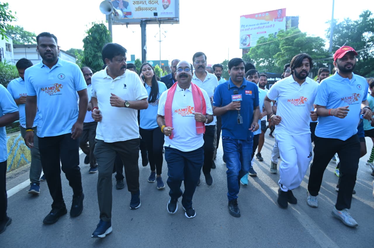 उप मुख्यमंत्री सह खेल एवं युवा कल्याण मंत्री अरुण साव ने आज यशस्वी प्रधानमंत्री नरेंद्र मोदी जी के 75वें जन्मदिवस पर आयोजित ‘नमो युवा रन’ रायपुर का तेलीबांधा तालाब में झंडा लहराकर किया आरंभ। साव ने प्रदेश के अंतरराष्ट्रीय, राष्ट्रीय खिलाड़ियों एवं युवाओं के साथ दौड़ लगाकर स्वस्थ और नशामुक्त भारत के निर्माण के लिए युवाओं को संदेश दिया। पहली बार उप मुख्यमंत्री कद के व्यक्तित्व को कदम से कदम मिलाकर साथ दौड़ता देख युवाओं में जोश और उत्साह का संचार हुआ। 10 हजार से अधिक युवाओं ने नशे को हराकर नशा मुक्त और स्वस्थ भारत बनाने का संकल्प लिया। डिप्टी सीएम साव ने कहा, इससे ही आदरणीय मोदी जी का 2047 तक विकसित भारत बनाने का संकल्प पूरा होगा। वहीं यह दौड़ सुभाष स्टेडियम में सकारात्मक ऊर्जा के साथ समाप्त हुई।