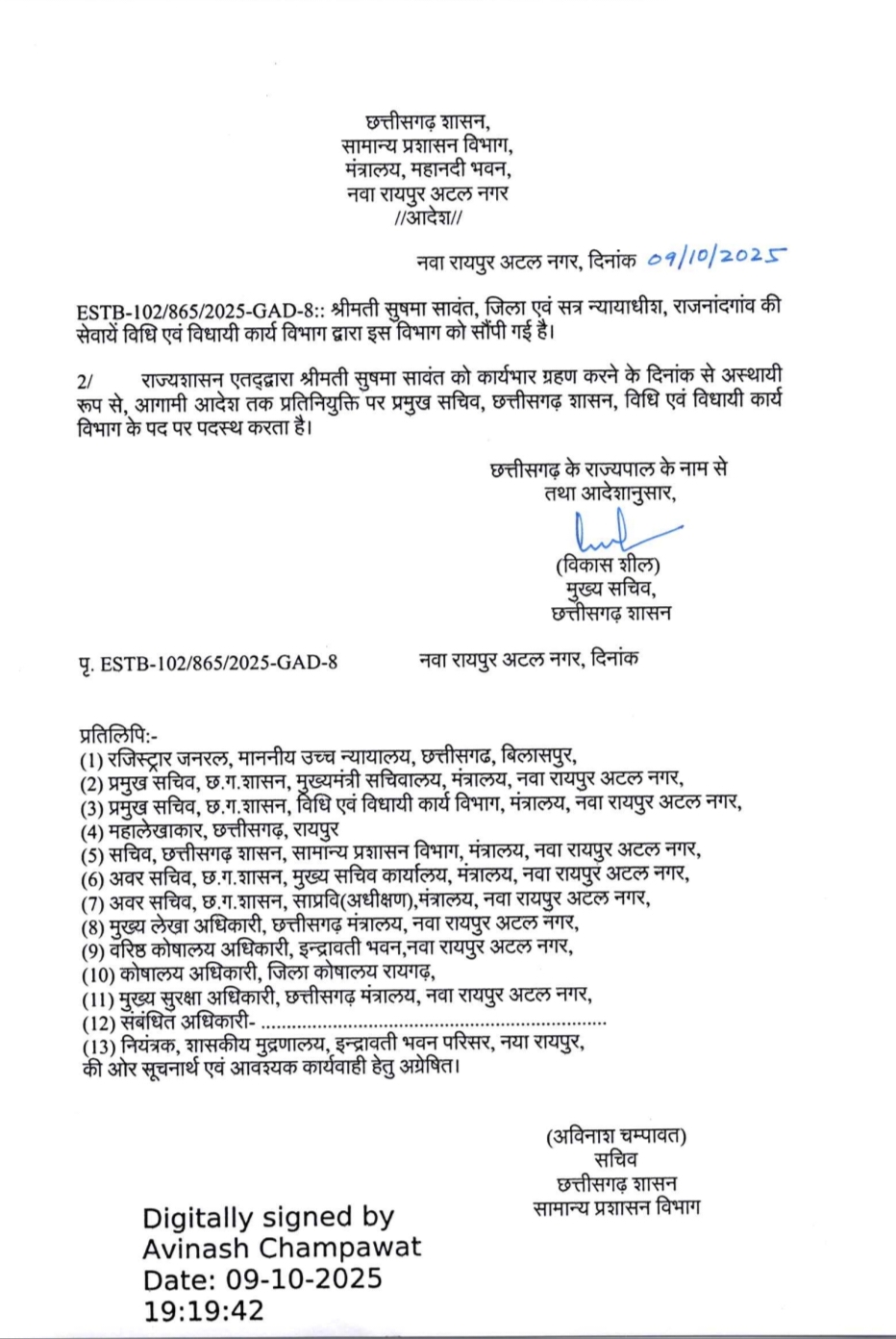 छत्तीसगढ़ में विधि एवं विधायी कार्य विभाग में प्रमुख सचिव के पद पर सुषमा सावंत की नियुक्ति हुई है । सुषमा सावंत बिलासपुर और महासमुंद में जिला न्यायाधीश के पद पर सेवाएं दे चुकी हैं, फिलहाल राजनांदगांव में बतौर जिला न्यायाधीश पदस्थ थी ।