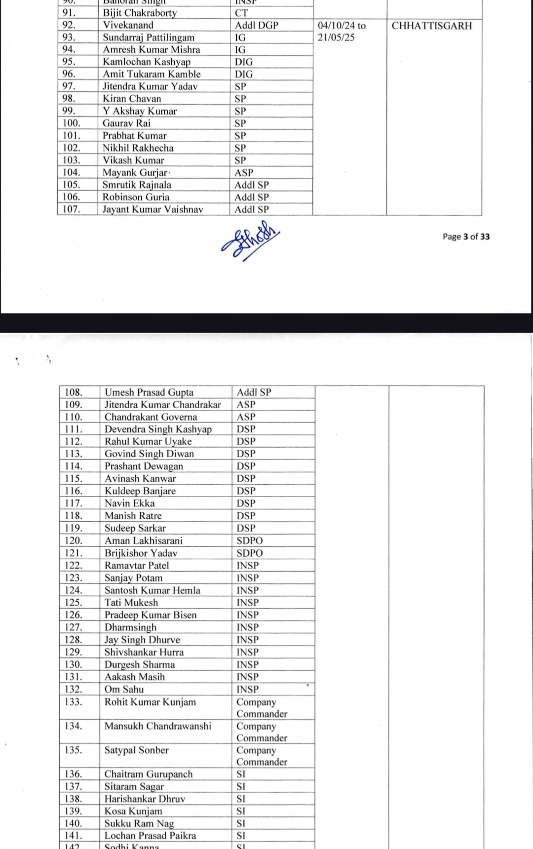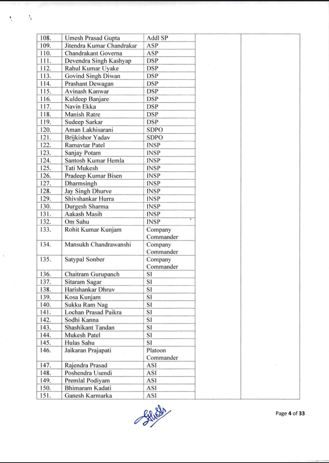 आईपीएस अधिकारियों में छत्तीसगढ़ के नक्सल चीफ और एडीजी एसआईबी, आर्म्स फोर्स विवेकानंद, बस्तर आईजी सुंदरराज पी०, रायपुर आईजी अमरेश मिश्रा, डीआईजी कमललोचन कश्यप, डीआईजी अमित कांबले समेत आईपीएस जीतेंद्र यादव, आईपीएस किरण चवन, वाय अक्षय कुमार, गौरव राय, प्रभात कुमार, निखिल रखेचा, विकास कुमार, मयंक गुर्जर, स्मृतिक राजनला, राबिंसन गुड़िया, जयंत कुमार वैष्णव और उमेश गुप्ता शामिल हैं। इसके अलावा दो एएसपी, 11 डीएसपी समेत 225 थानेदार और कांस्टेबल शामिल हैं। इसी तरह इंवेस्टिगशन केटेगरी में 93 को पदक के लिए चुना गया है, उनमें मयंक मिश्रा एसआई, कैलाश चंद दास, नीतेश सिंह ठाकुर इंस्पेक्टर हैं।