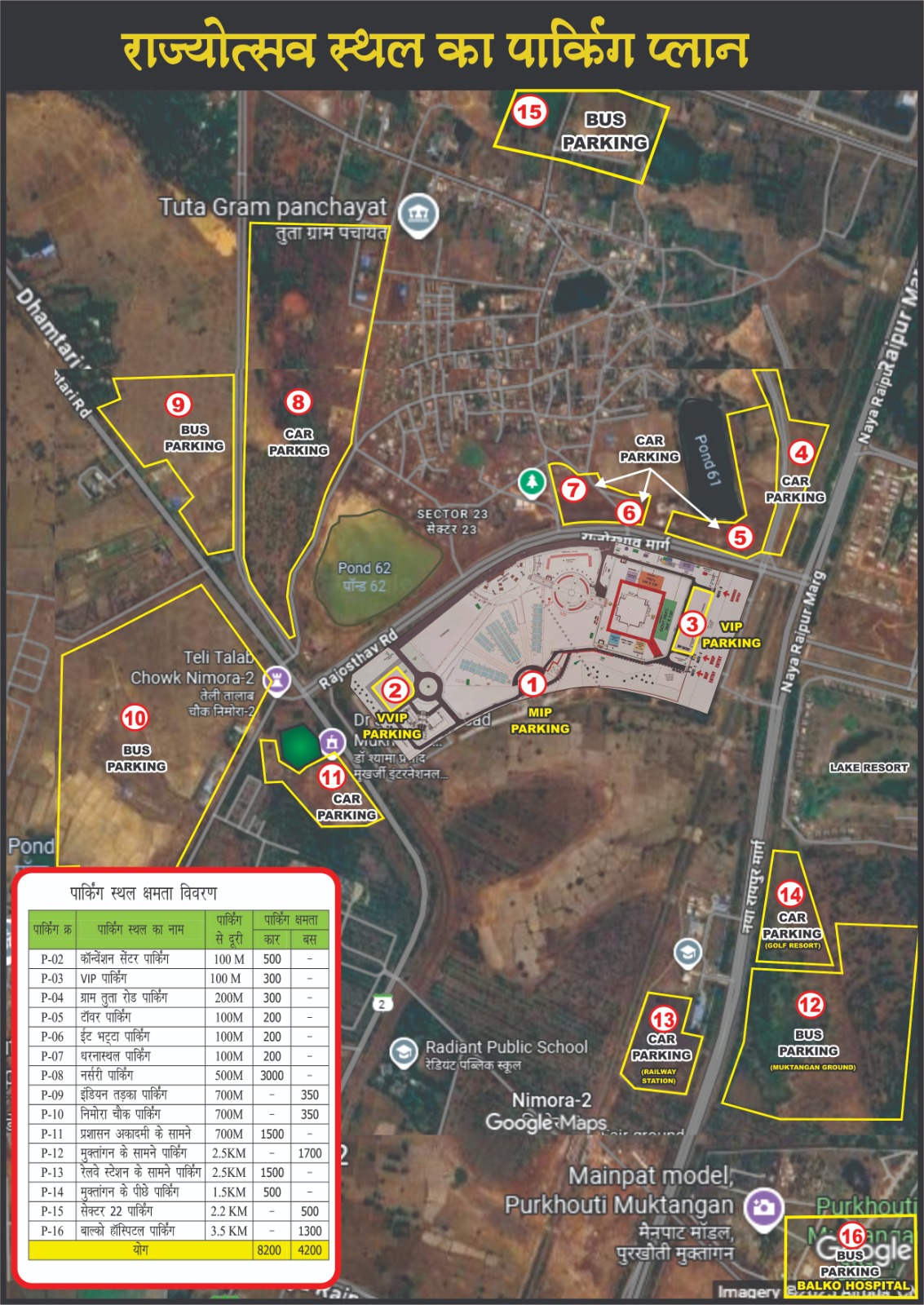 देवेन्द्र नगर और शहर की ओर से आने वाले वाहन सेरीखेड़ी ब्रिज – नवा रायपुर एयरपोर्ट तिराहा – स्टेडियम टर्निंग – खूबचंद बघेल चौक – सीबीडी रेलवे स्टेशन चौक – राज्योत्सव तिराहा – मुक्तांगन तिराहा से दाहिने टर्न – परषट्टी चौक से दाहिने – निमोरा प्रशासनिक एकादमी के सामने नहर पुलिया पार कर बाएं मुड़कर कन्वेंशन सेंटर (पानी टंकी) के सामने स्थित पार्किंग पी-02 में वाहन पार्क करेंगे।