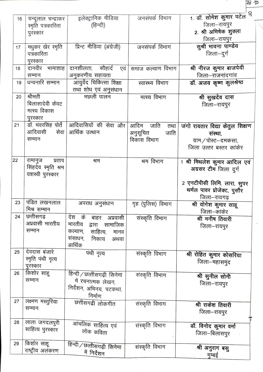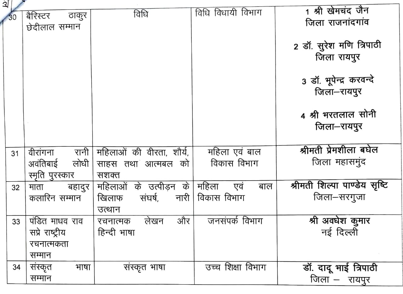 छत्तीसगढ़ सरकार ने राज्य अलंकरण पुरस्कारों की घोषणा कर दी है। इस अवसर पर संस्कृति मंत्री राजेश अग्रवाल ने जानकारी दी कि राज्योत्सव समापन समारोह में आज उपराष्ट्रपति पुरस्कार विजेताओं को सम्मानित करेंगे। इस वर्ष कुल 34 अलंकरण पुरस्कारों की घोषणा की गई है और 40 लोगों को विभिन्न क्षेत्रों में उनके उत्कृष्ट योगदान के लिए सम्मानित किया जाएगा।