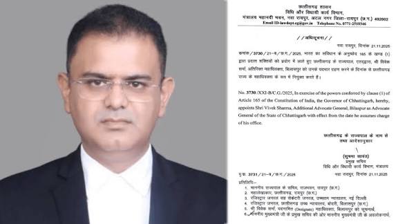 छत्तीसगढ़ सरकार ने शुक्रवार को एक बड़ा प्रशासनिक निर्णय लेते हुए हाईकोर्ट के महाधिवक्ता प्रफुल्ल एन भारत का इस्तीफ़ा स्वीकार कर लिया है। उनके स्थान पर अतिरिक्त महाधिवक्ता विवेक शर्मा को राज्य का नया महाधिवक्ता नियुक्त किया गया है। इस संबंध में विधि और विधायी कार्य विभाग ने आधिकारिक आदेश जारी कर दिया है।