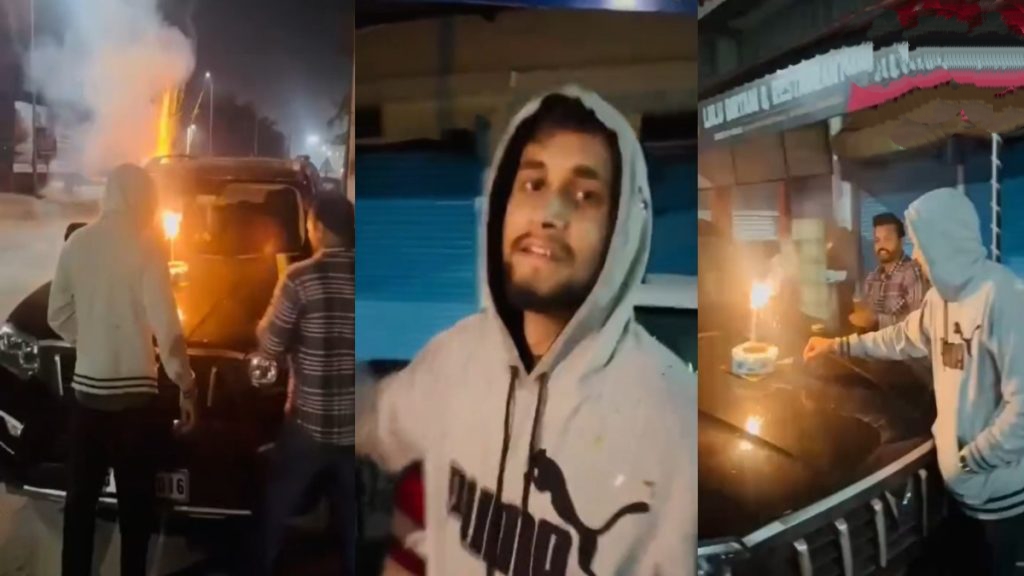 घटना का वीडियो तेजी से वायरल हो रहा है, जिसमें बीएमओ और उनका साथी कार के बोनट पर केक काटते और पटाखे फोड़ते दिख रहे हैं।