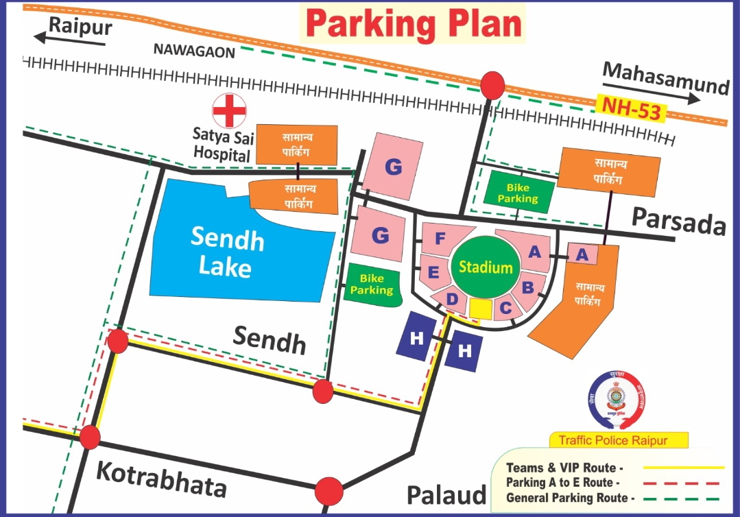 जिनके पास A, B, C, D, E, F, G पार्किंग पास हैं, वे सेरीखेड़ी ओवरब्रिज → नया रायपुर प्रवेश → स्टेडियम टर्निंग → डॉ खूबचंद बघेल चौक → कयाबांधा → कोटराभांठा → सेक्टर 04/10 से होकर