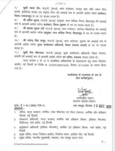 छत्तीसगढ़ शासन ने प्रशासनिक स्तर पर बड़ा फेरबदल करते हुए 11 IAS अधिकारियों के तबादले किए हैं। इस आदेश में 6 जिलों के कलेक्टर बदले गए हैं, जिनमें सरगुजा, कोरबा, दंतेवाड़ा, सुकमा, बेमेतरा और नारायणपुर शामिल हैं। इसके साथ ही स्वास्थ्य विभाग, नगर निगम और जिला पंचायत स्तर पर भी अहम बदलाव किए गए हैं।