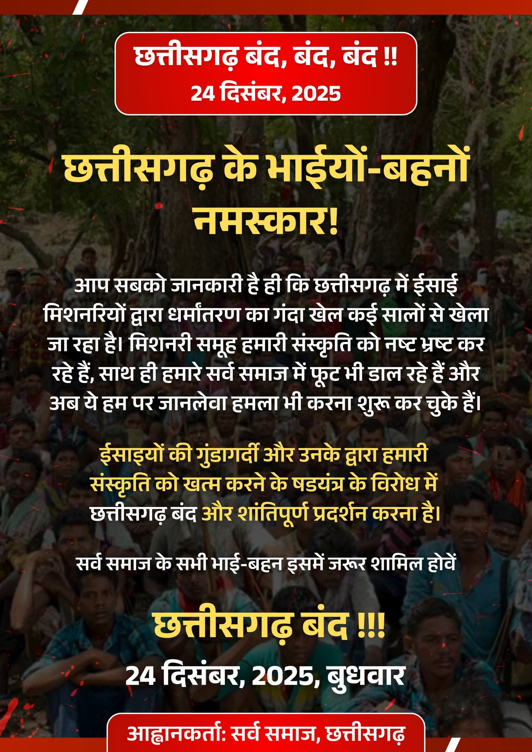 छत्तीसगढ़ के कांकेर जिले के क्षेत्र अंतर्गत बड़े तेवड़ा गांव में धर्मांतरित व्यक्ति के शव दफन को लेकर हुए विवाद के बाद सर्व समाज छत्तीसगढ़ ने 24 दिसंबर को प्रदेश बंद की घोषणा की है । इस घोषणा (बंद) को छत्तीसगढ़ चैंबर ऑफ कॉमर्स एंड इंडस्ट्रीज ने भी समर्थन दिया है ।