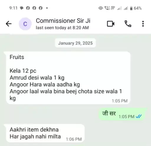 दुर्ग नगर निगम में असिस्टेंट ग्रेड-3 भूपेंद्र गोइर ने एडवोकेट संदीप दुबे और मानस वाजपेयी के माध्यम से हाईकोर्ट में याचिका दायर की। याचिका के साथ व्हाट्सएप चैट्स के स्क्रीनशॉट भी पेश किए गए हैं। आरोप है कि कमिश्नर सुमित अग्रवाल ने कई बार निजी फरमाइशें कीं—फल, चावल, मूवी टिकट, एसी, गैस सिलेंडर और बंगले से जुड़े इंतजामों तक की मांग की गई।